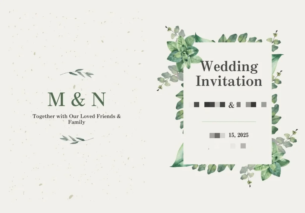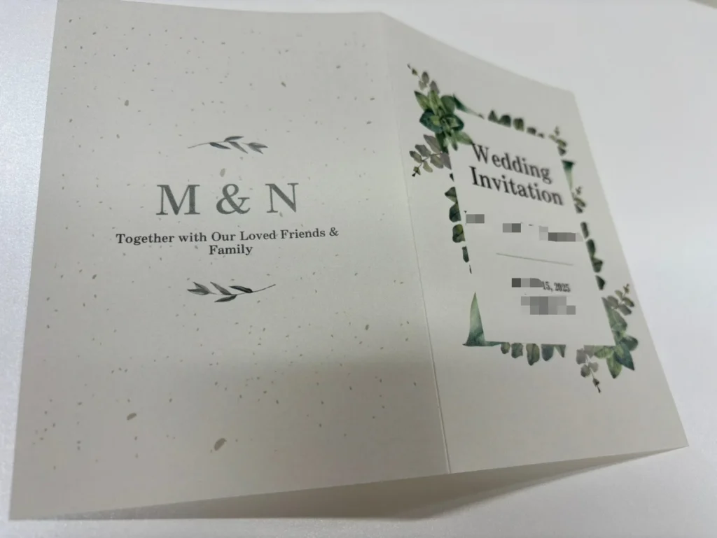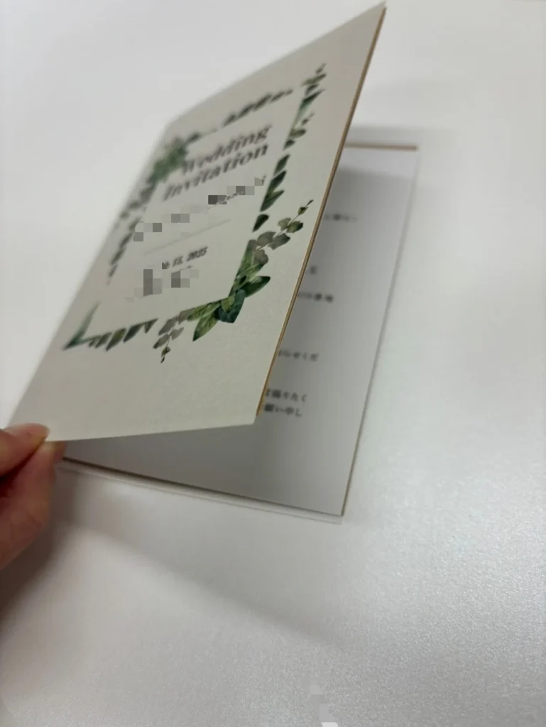 今回は合わせて返信用ハガキに宛名印字、招待状に2つ折り加工、招待状用封筒も手配し宛名印字までさせて頂き、まるっと納品させて頂きました。