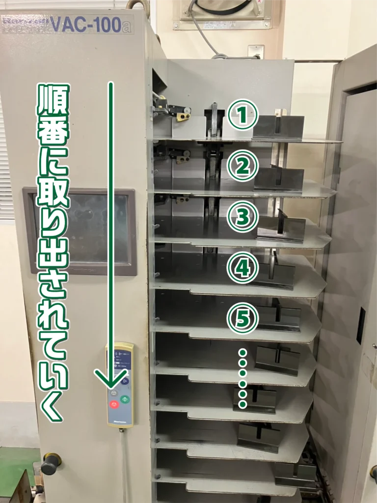 上から下に向かって、セットした用紙が順番通りに供給され、丁合されます。