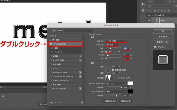 次に、「ベベルとエンボス」をダブルクリックして編集画面を開きます。