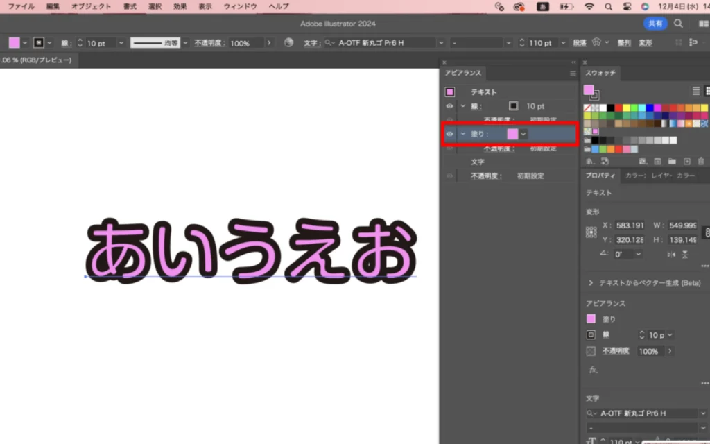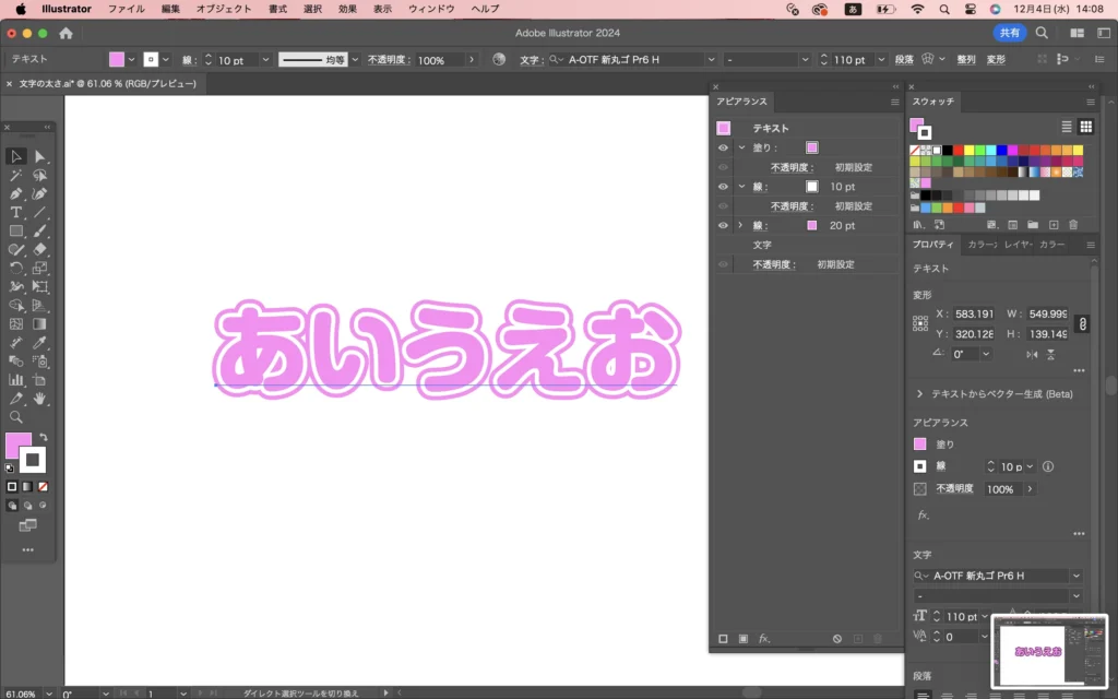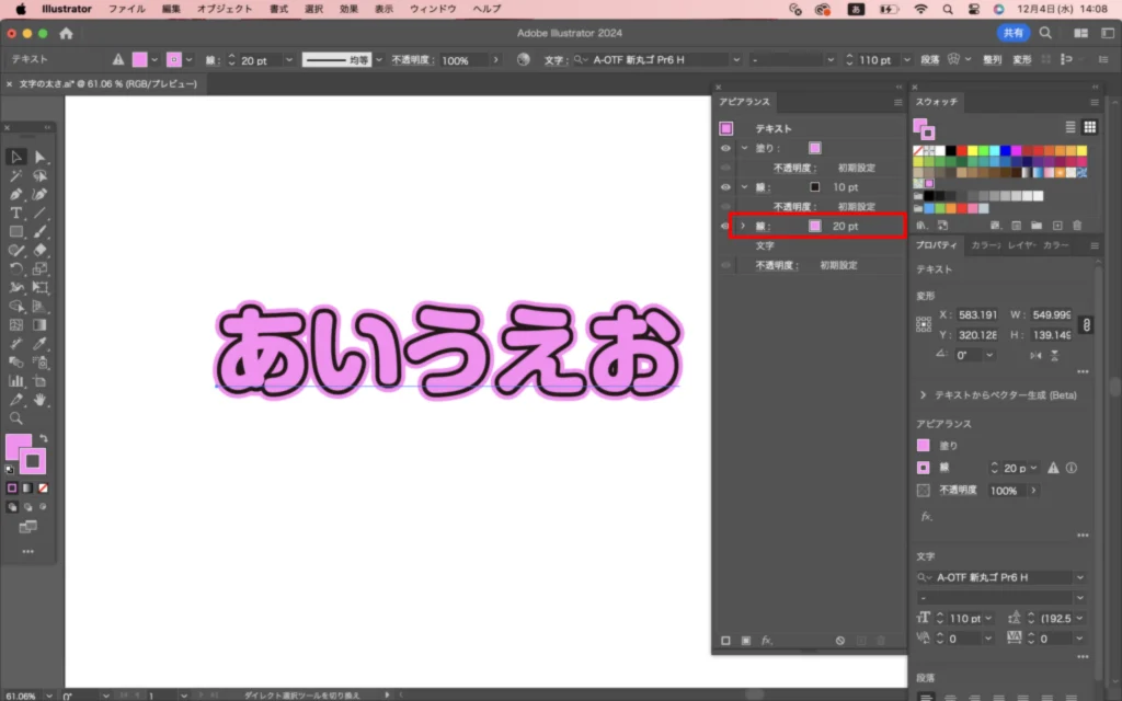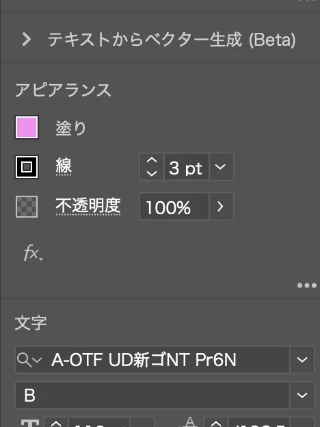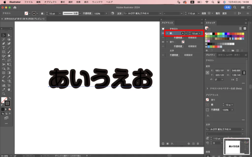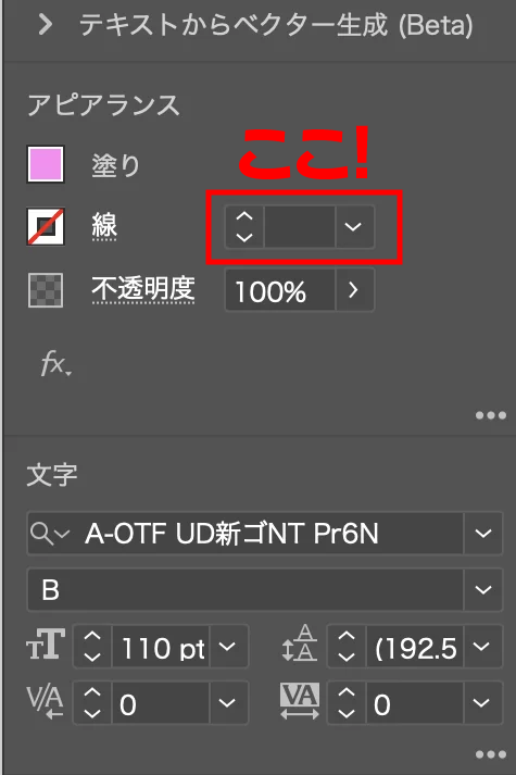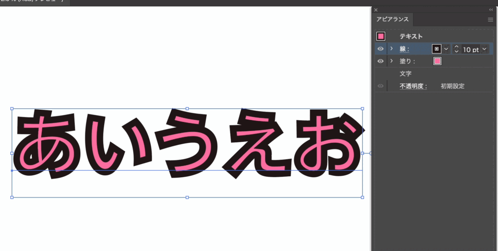 今下に貼り付けた文字の方が選択されているので、そのまま右側アピアランスパネルから、線の幅を太くします。