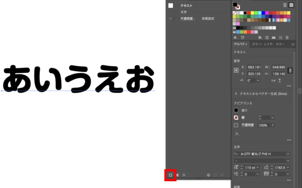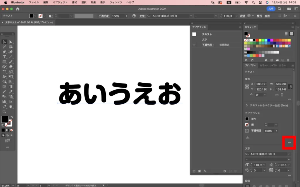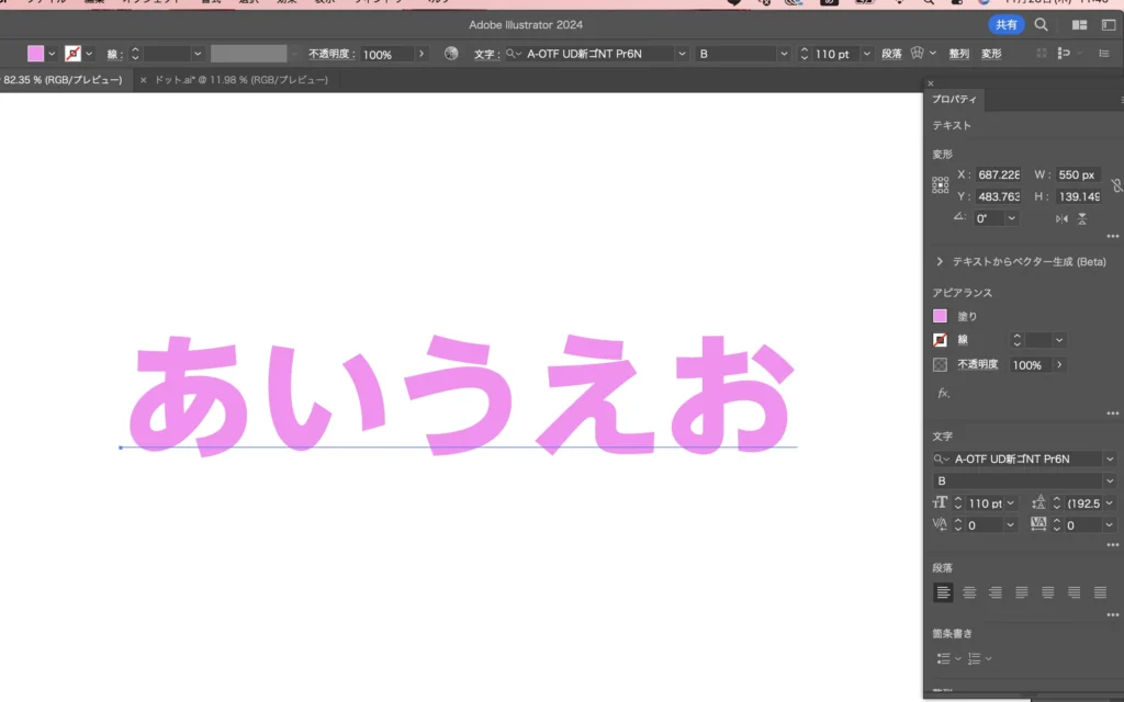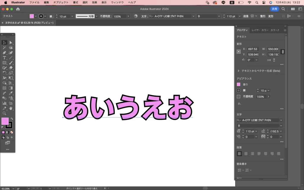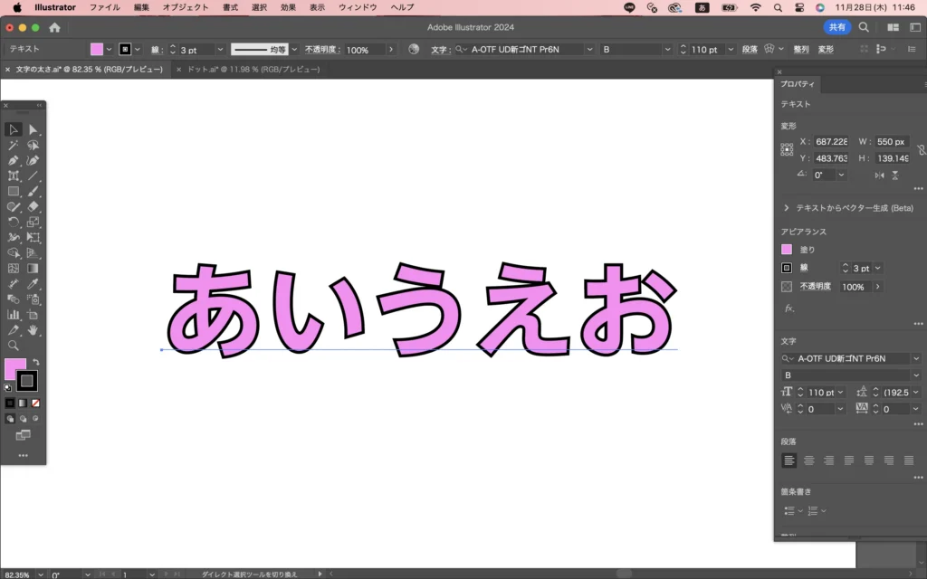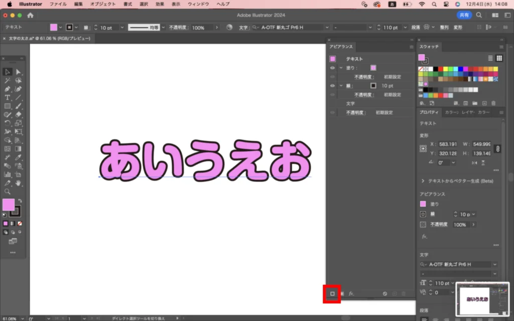 今下に貼り付けた文字の方が選択されているので、そのまま右側アピアランスパネルから、線の幅を太くします。