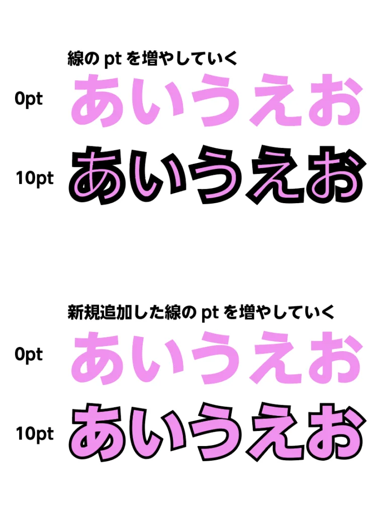 上に乗せた縁がどんどん太くなるイメージなので、↓ あまり太くすると文字(ピンクの塗りの部分)が潰れて見えてしまいます。