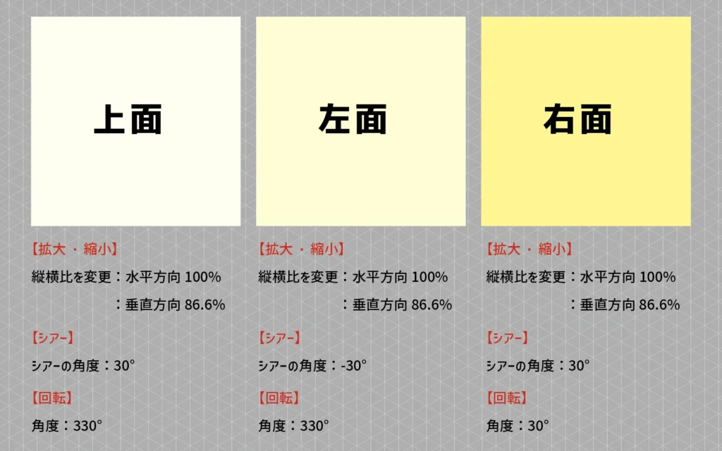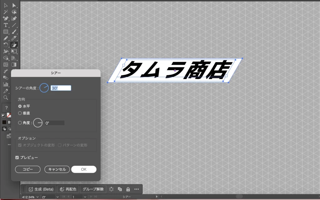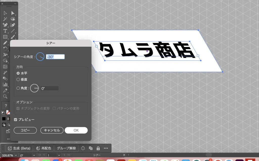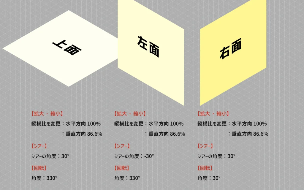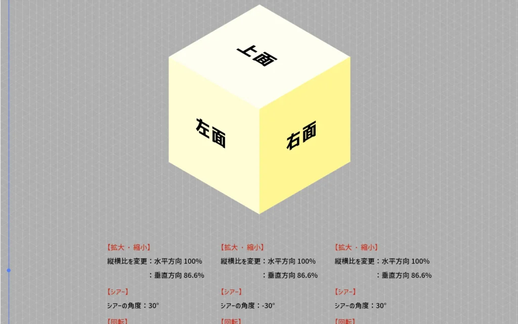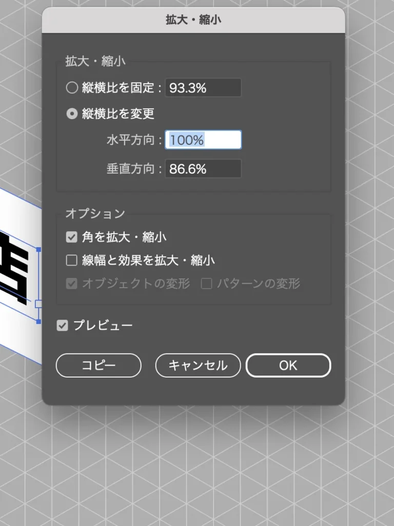 そこで、「オブジェクト→変形→拡大・縮小」パネルから「縦横比を変更→水平方向:100%→垂直方向:86.6%」を適用させてからシアーや角度を変えるとちょうどいい具合にしてくれますよ。