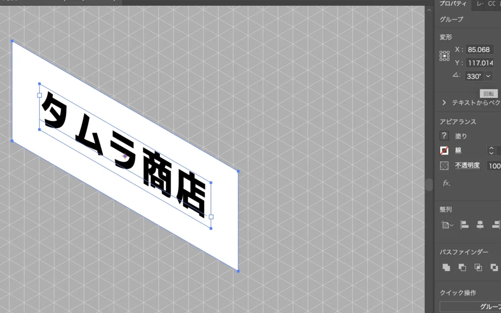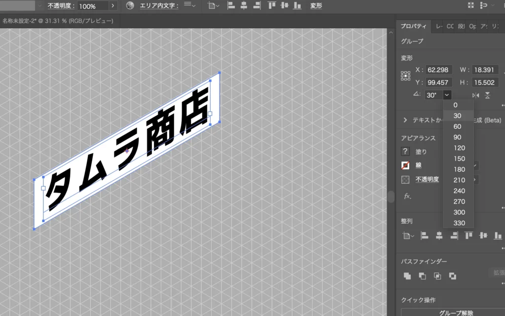 ※右端のプロパティからでも、 上の「オブジェクト→変形→回転」どちらでもできます♩