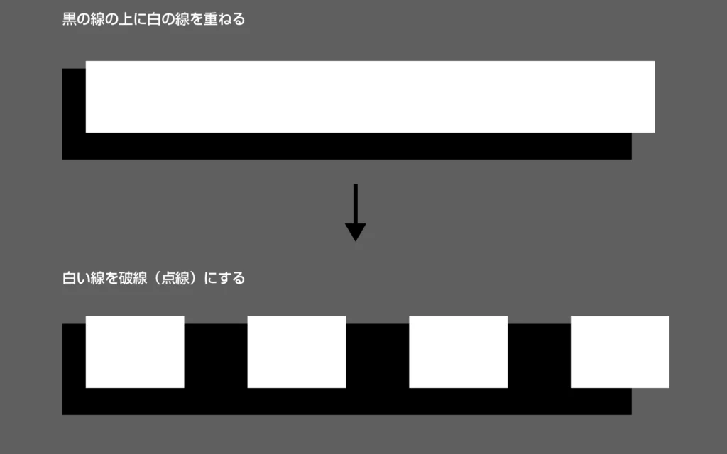 黒い線をひいて、「線を追加」で上に白い線を追加します。それを細くして「破線」という効果をつけると