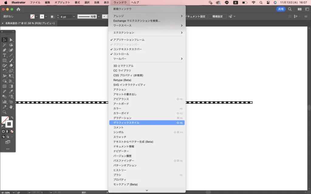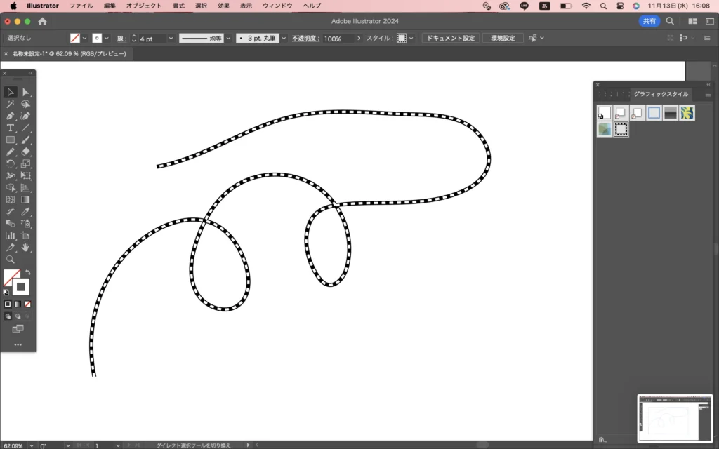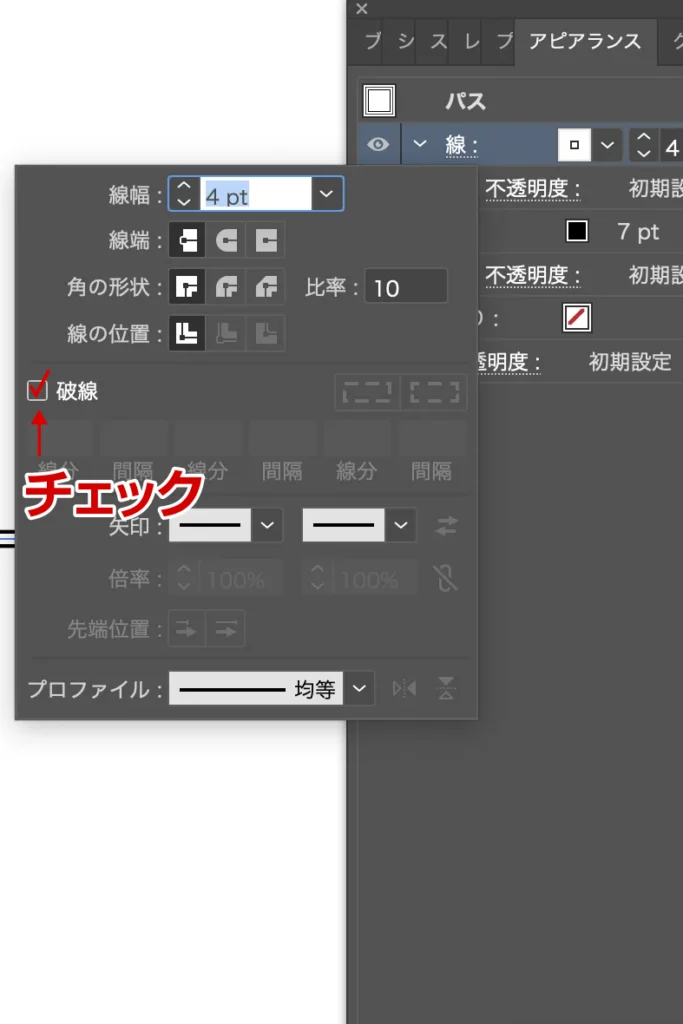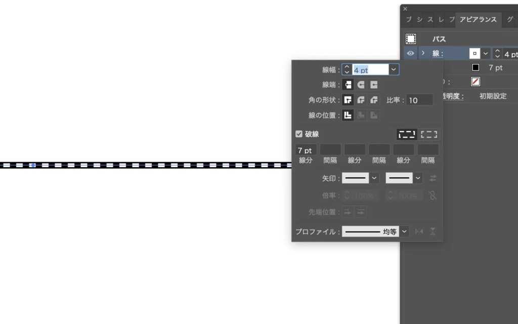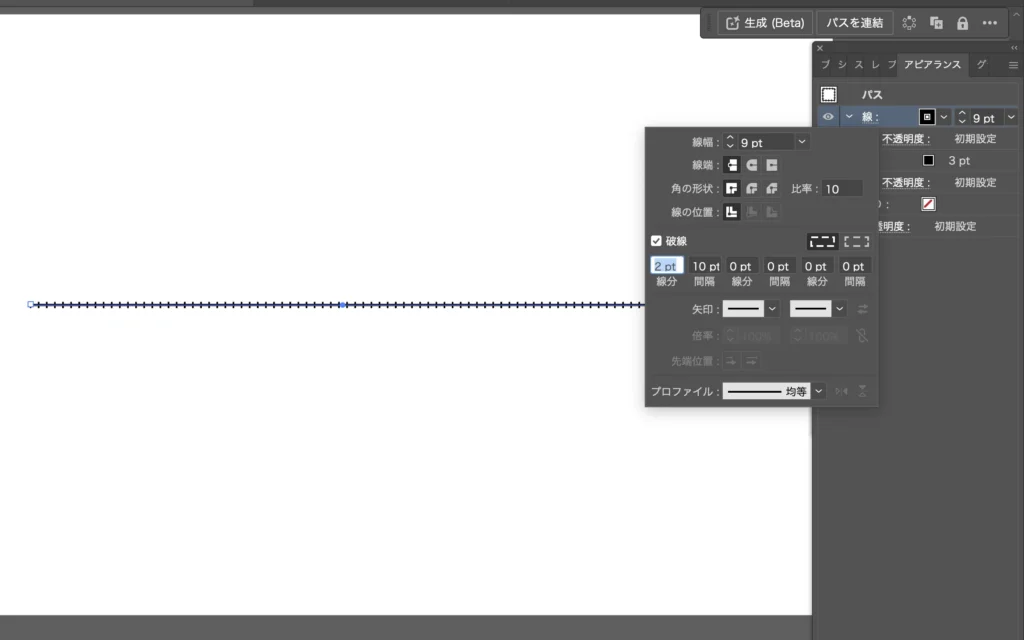 線パネルから破線を選択、線分は2ptに。間隔は10ptにしてみました。