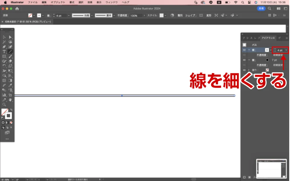 白くした線の太さを、7ptから4ptに変更します。(黒より小さい数値ならOK)