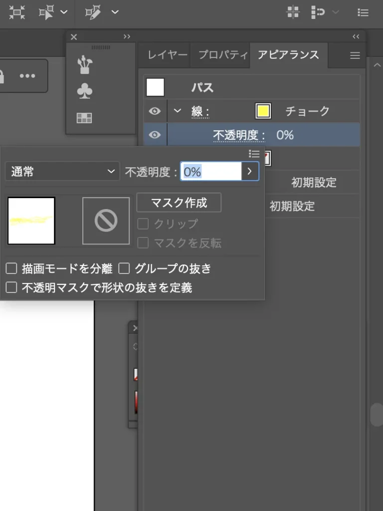 アピアランスパネルで、線の「不透明度」をクリックして出てきたパネルの中の