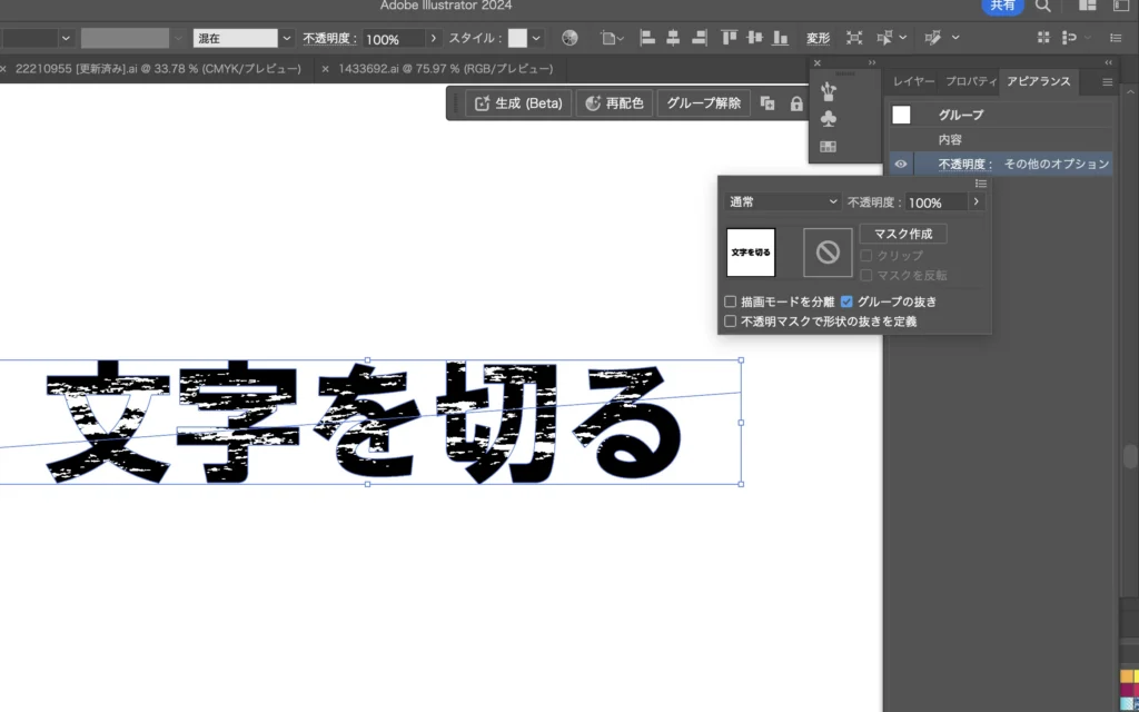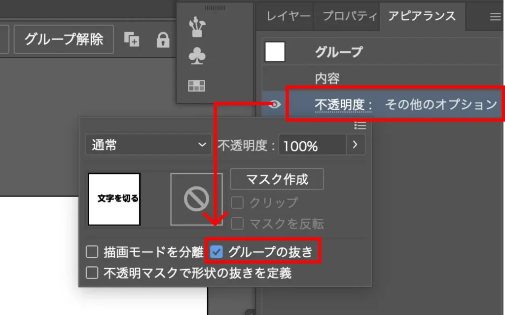 またアピアランスパネルを開いて「不透明度」をクリック、
