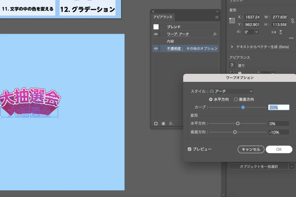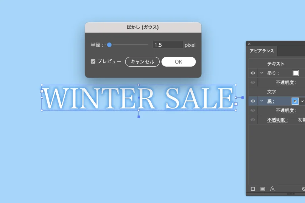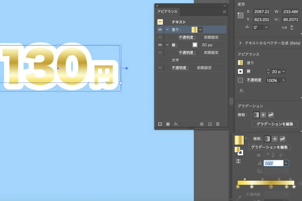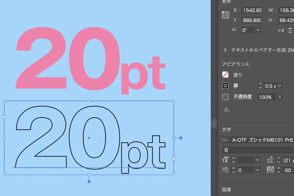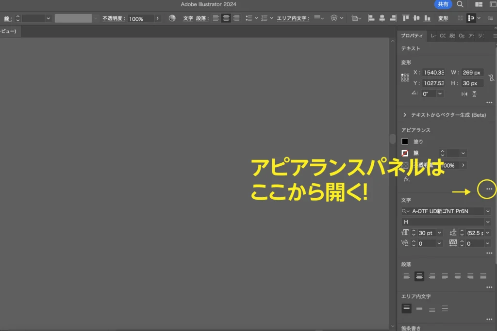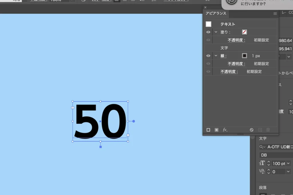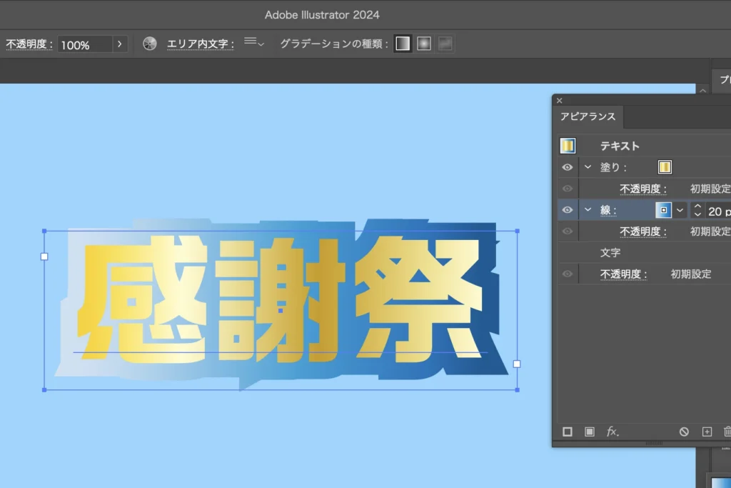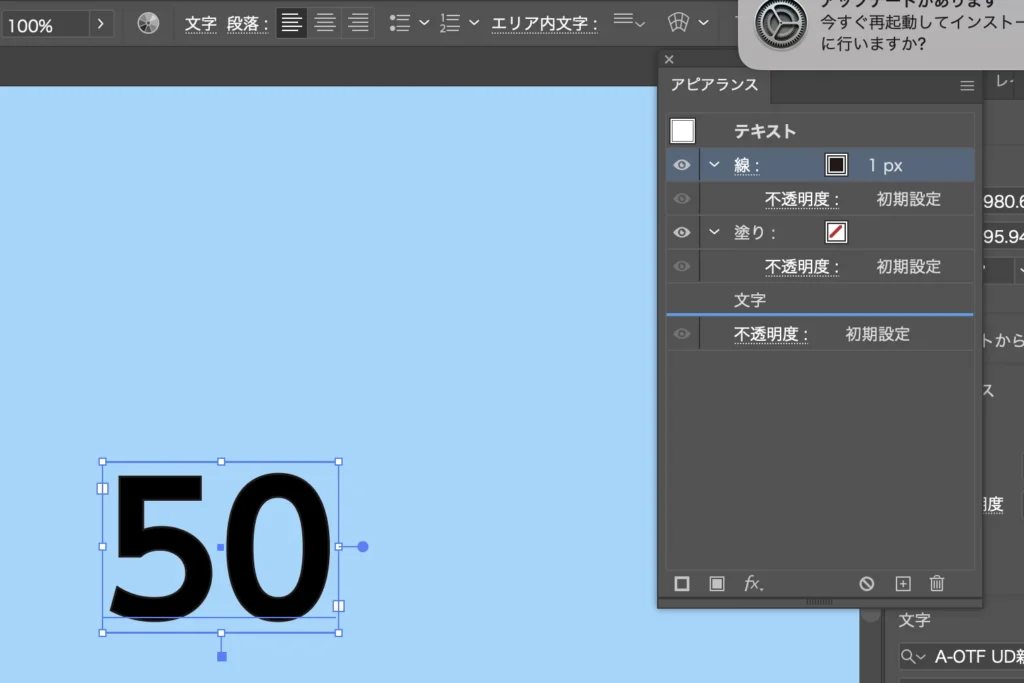 文字を入力、アピアランスパネルを開いてフチをつける(フチの付け方は2.フチ文字で紹介しています)。
