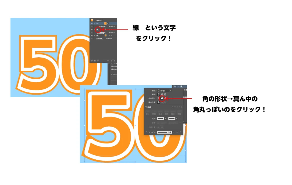 角張っているのを丸くしたい時は、アピアランスパネルの中の【線】をクリックすると
