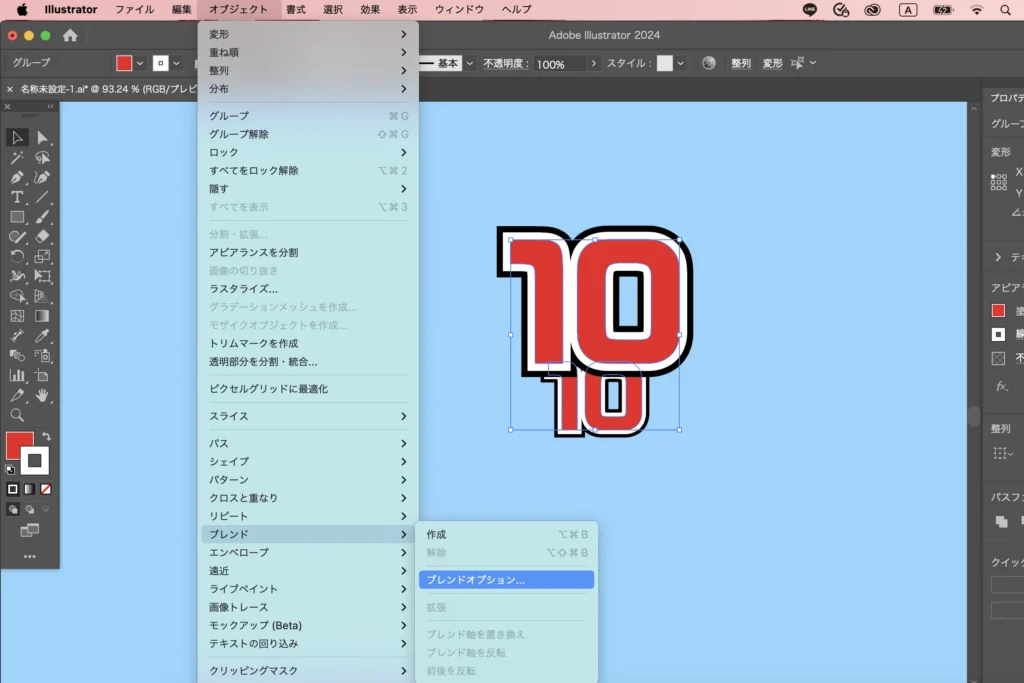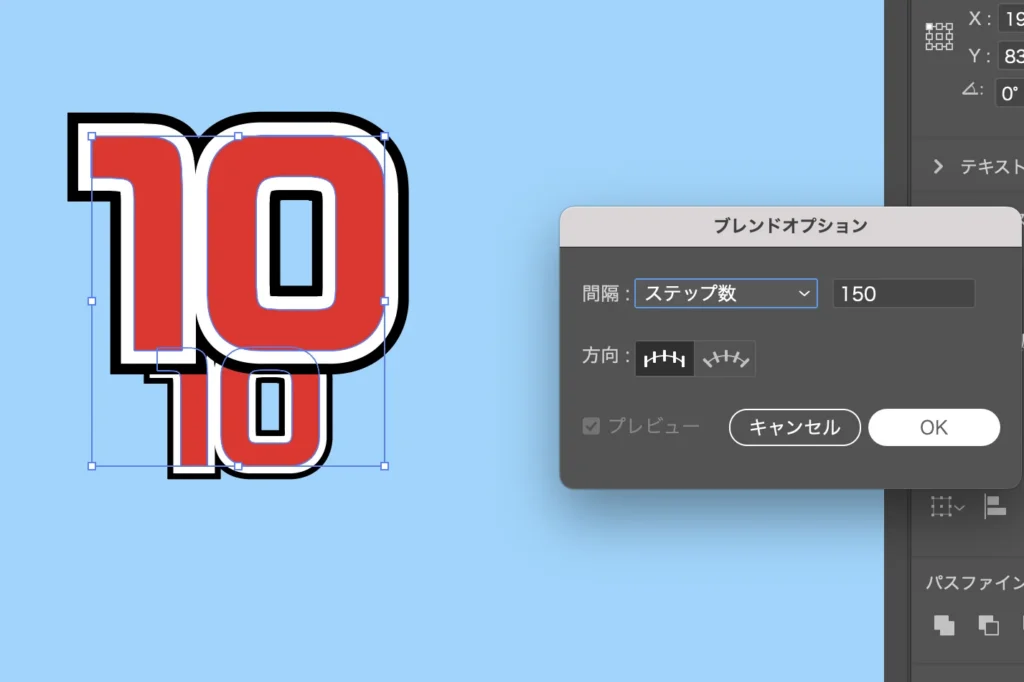 2つを選択して、オブジェクト→ブレンド→ブレンドオプション