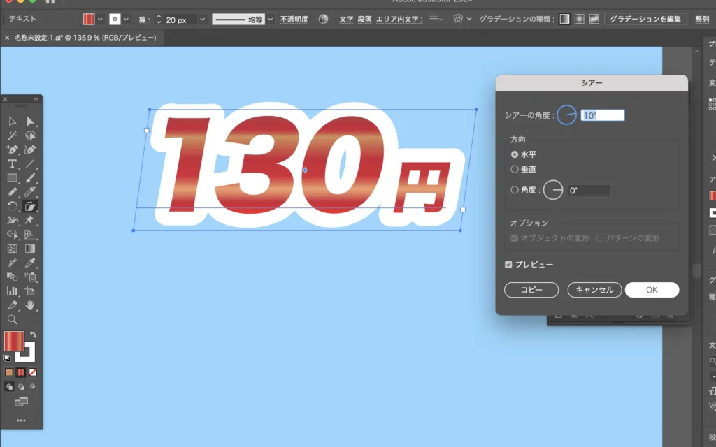 シアーツール(分かりますか??左のツールバーで言うと右列の中央あたり)で10°傾け、