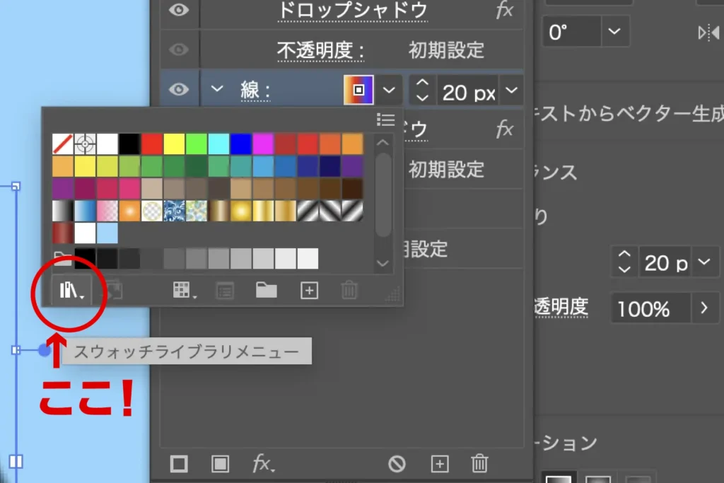 アピアランスパネルを開いて、文字の【塗り】の色のボックスをクリックすると↓こんなのが出てくるので