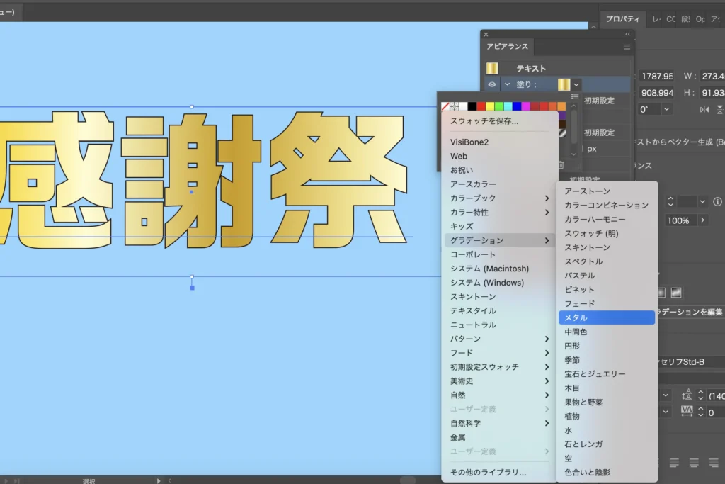塗りをグラデーションの金色にする(スウォッチ→左下のスウォッチライブラリメニュー→グラデーション→メタルで金属っぽいグラデーションが選べます!)