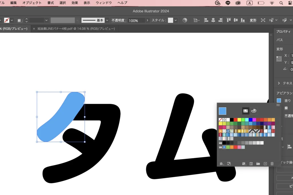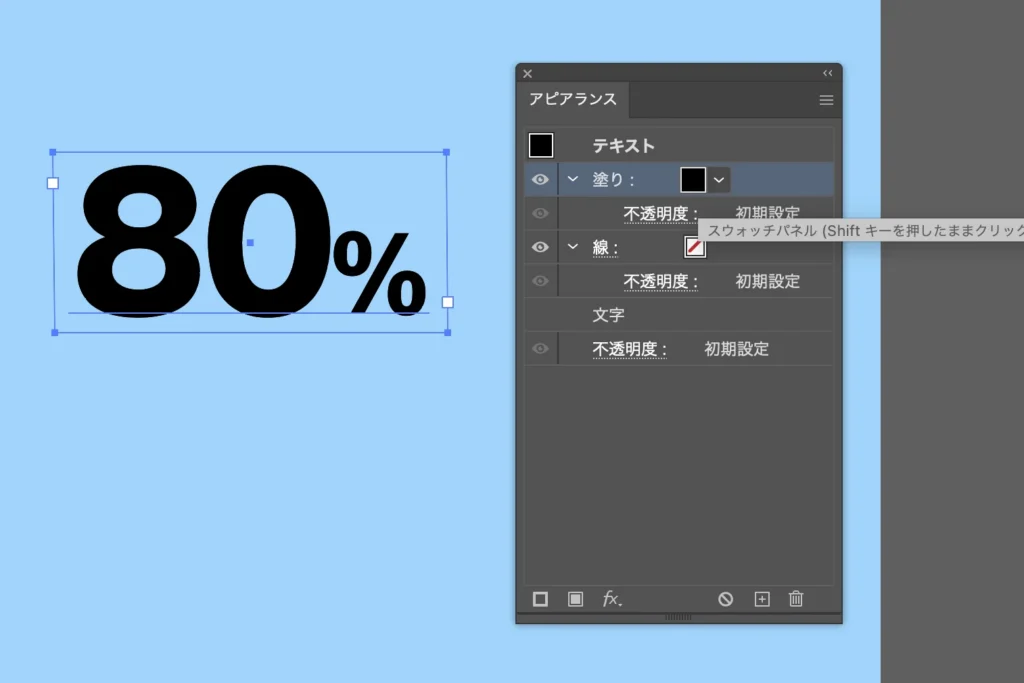 文字を入力、アピアランスパネルの【塗り】の色のついたボックスをクリックする。