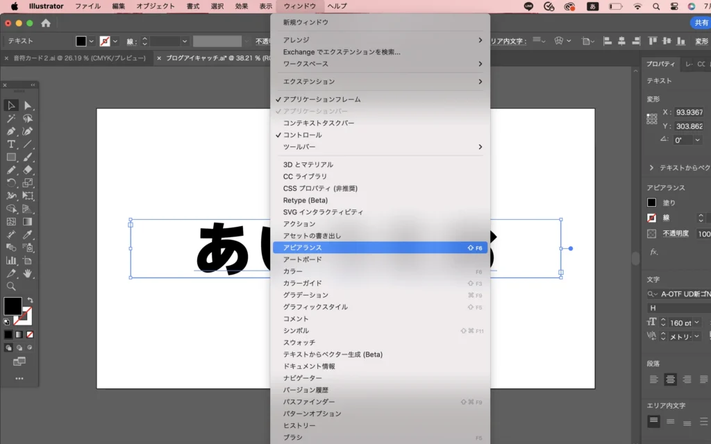 一番上の【ウィンドウ】→【アピアランス】を開く。