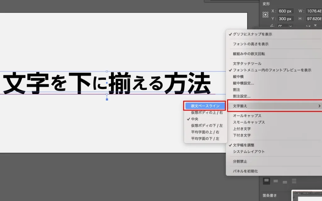 文字揃えを欧文ベースラインに変更します。
