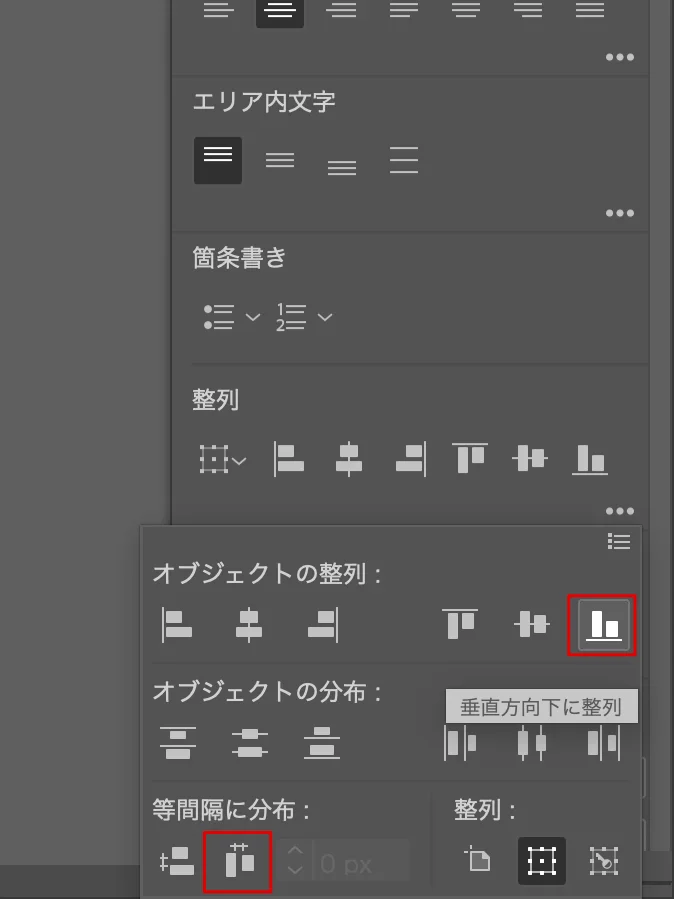 右端の「オブジェクトの整列」で下揃え、「等間隔に分布」で水平方向等間隔に分布を選択。