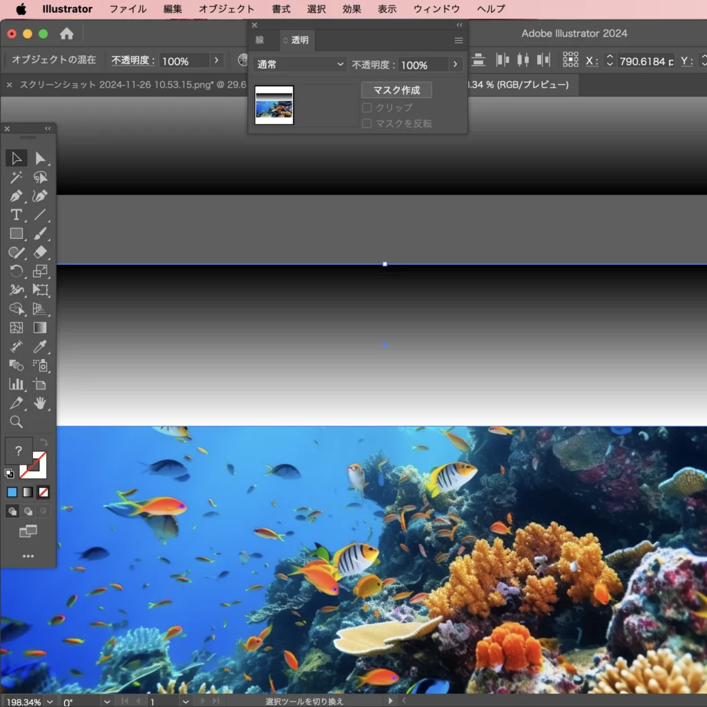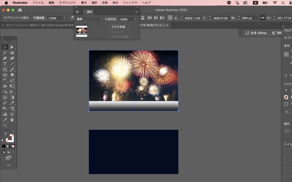 上の画像と上のグラデーションの長方形を2つ選択して、「マスク作成」をクリック