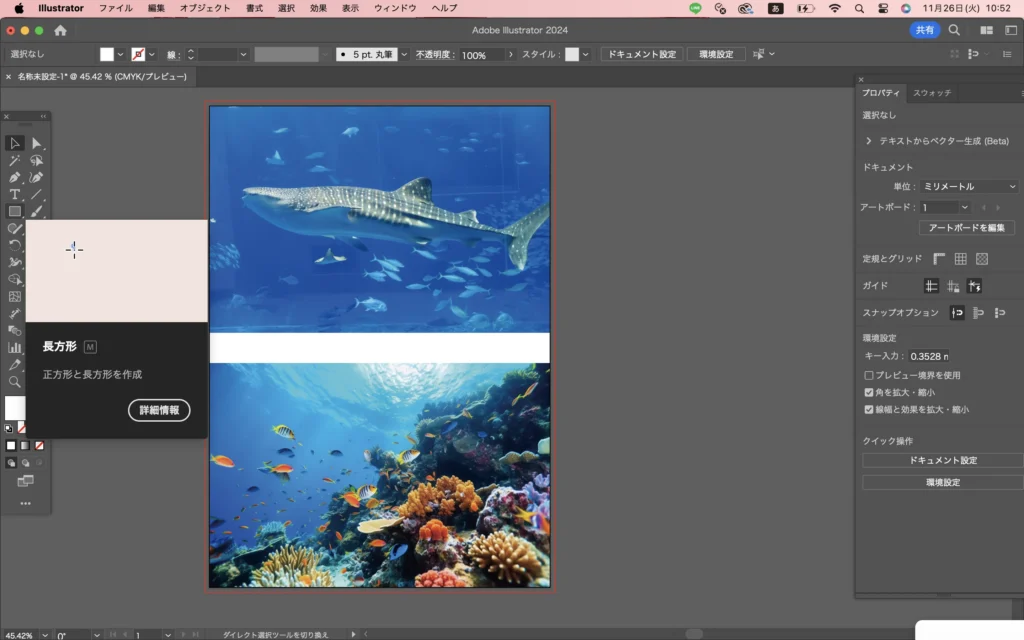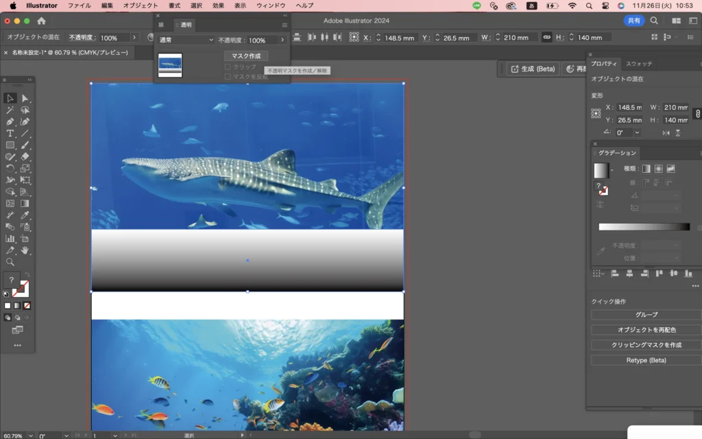 同様に、下の画像と下のグラデーションの長方形を2つ選択して「マスク作成」