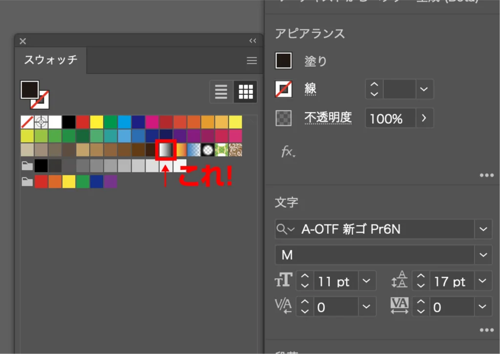 (グラデーションが「塗り」の中にない場合、画面上部の「ウィンドウ→スウォッチ」からでも選べます!)↓