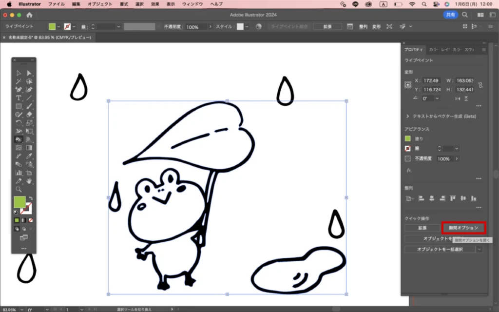 全選択してから、左のツールバーで「ライブペイント」をクリック。
