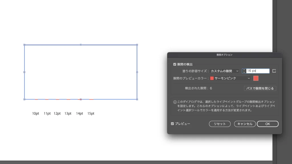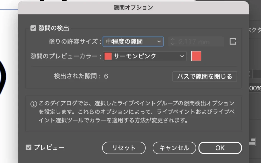 「塗りの許容サイズ」を好きな数値に設定し、プレビューにチェックを入れると…