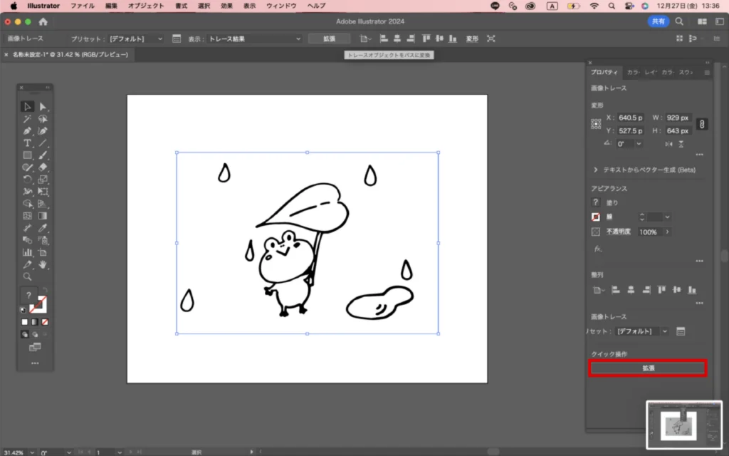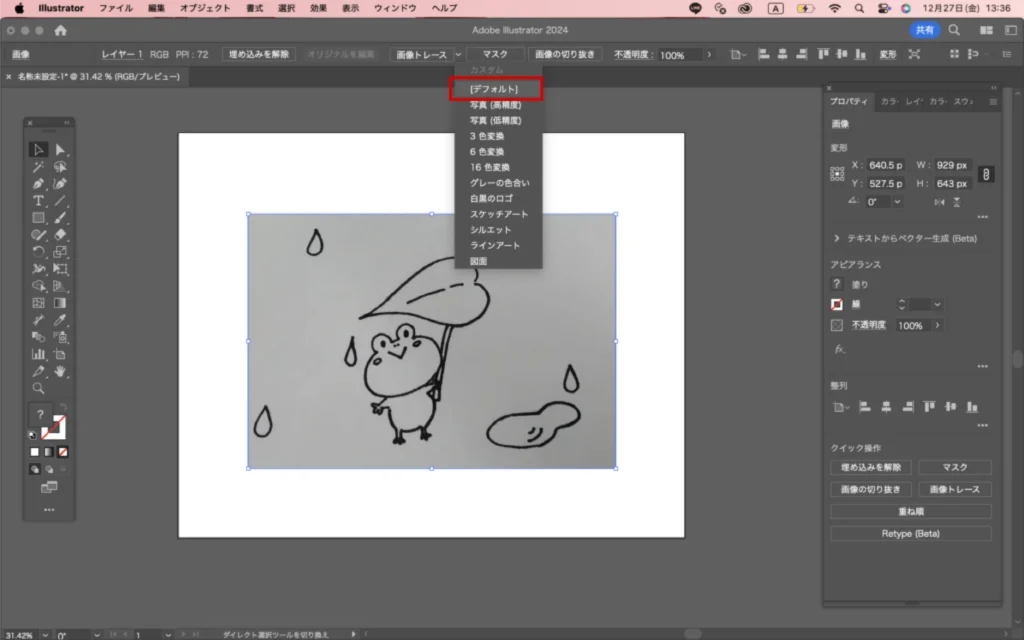 「画像トレース」をクリックします。次に「デフォルト」をクリック。
