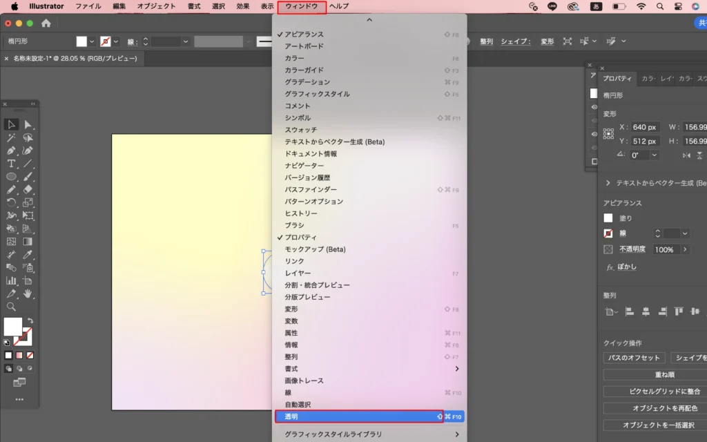 またオブジェクトを選択した状態で「ウィンドウ」→「透明」