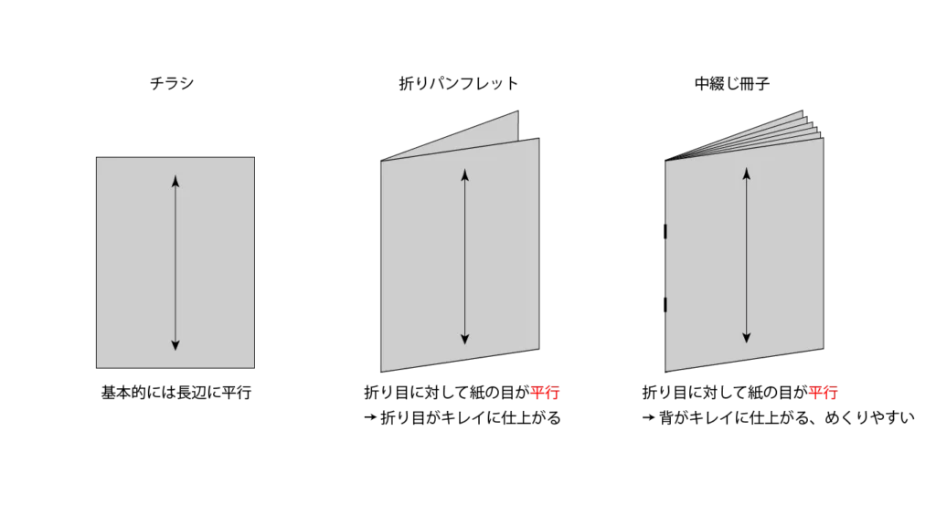 紙の目の選択を誤ってしまうと、仕上がりが悪くなったり、生産効率が下がったりすることにつながりますので、注意が必要です。