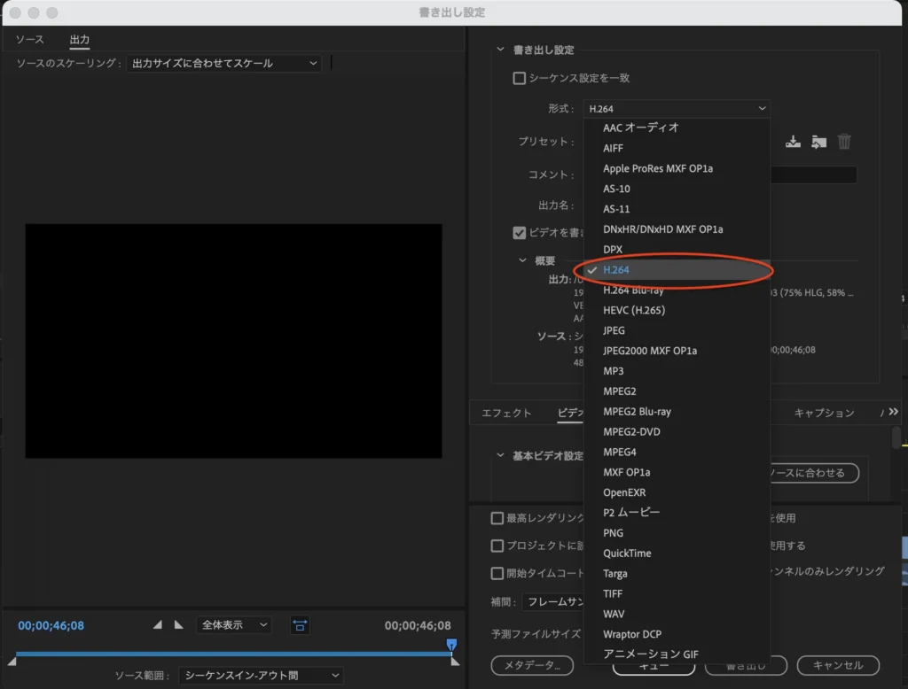 形式は「H.264」を選びます。これはMP4の拡張子になります。