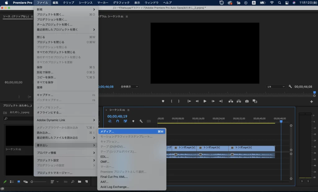 そして、「ファイル」→「書き出し」→「メディア」を選択します。