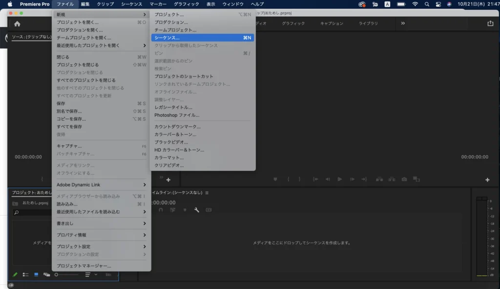「ファイル」→「新規」→「シーケンス」をえらびます。