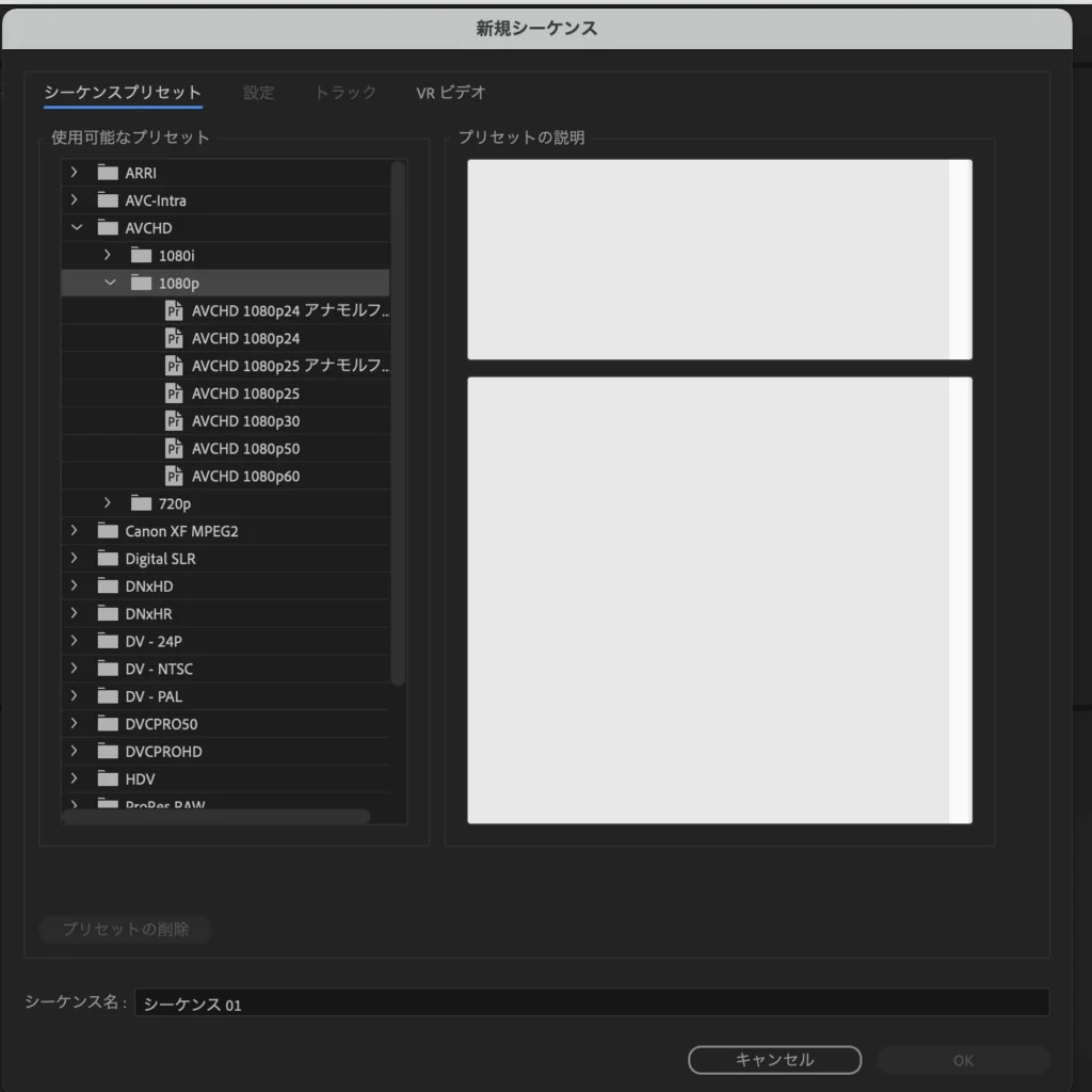 今回はYouTube用の1080pの動画を作るので、「AVCHD」の中の「1080p」を開きます。