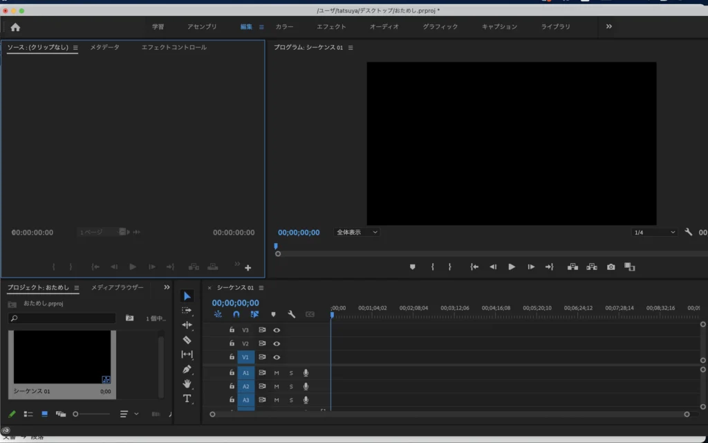 選び終わると画面の左下、プロジェクトの部分にシーケンスというものが現れました。