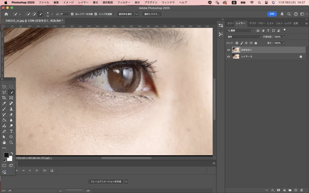クイック選択ツールなどで、白目を選択します。