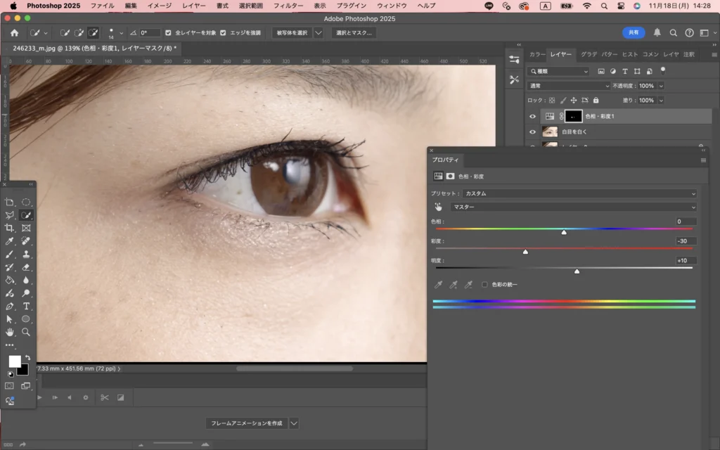 目の赤みを少し取りたいので、彩度を落として