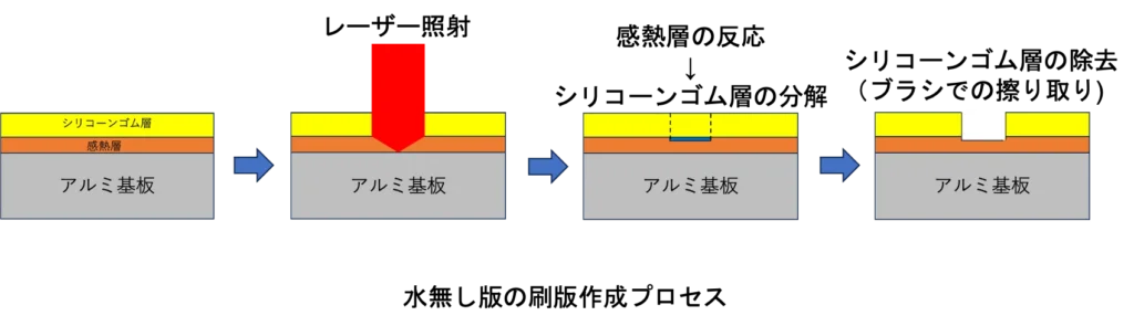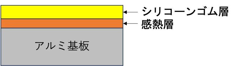 水無し版の構造は、アルミ基盤の上に感熱層、そのまた上にシリコーンゴム層が塗布されている積層構造となっています。