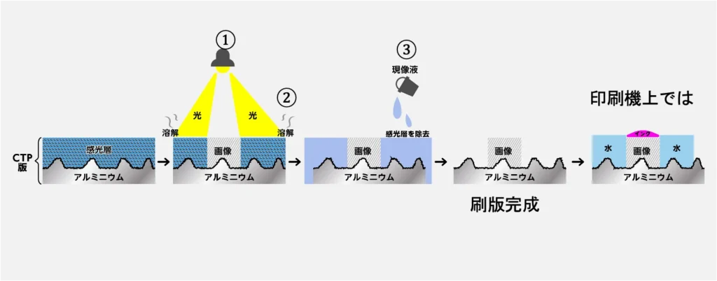 印刷機上では、版には水・インキが敷かれます。水と油の関係と、アルミ:親水性、感光層:親油性の性質を利用し、アルミ剥き出し部分には水が重なり、感光層にはインキが重なることで、画線部と非画線部を再現し印刷されます。