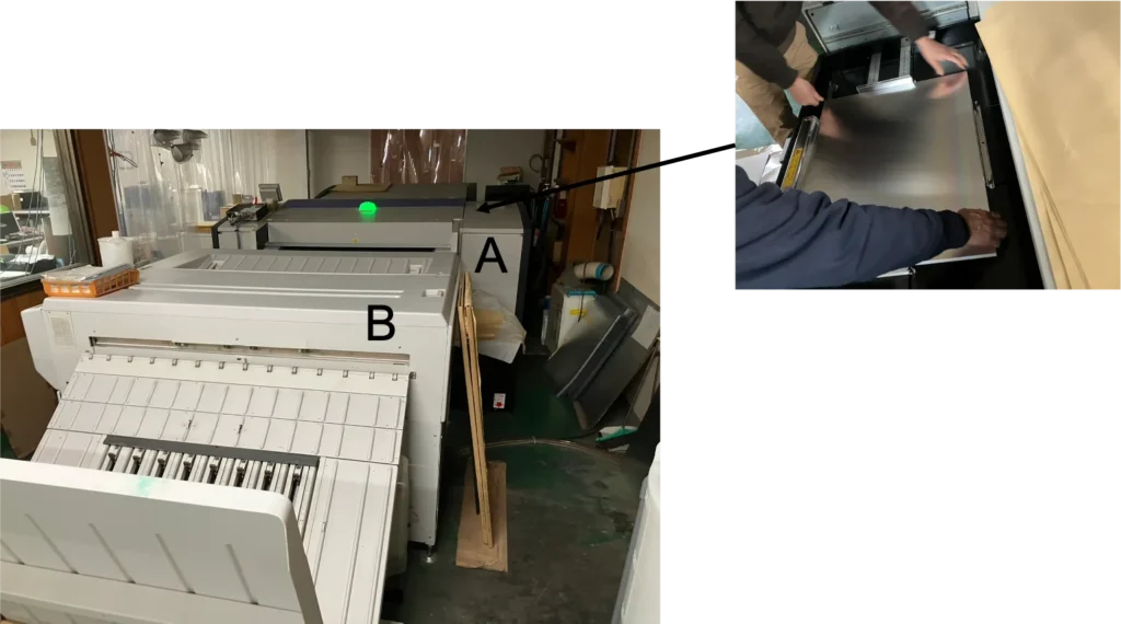 ① コピー機に紙をセットするように、CTP版を機械にセットします。
