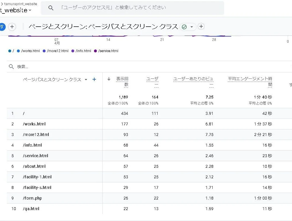 - どのぺージが何人に何回、平均何分何秒間みて頂けたか